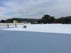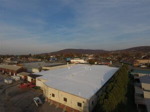 This project consisted of removing the existing membrane and 3/4” insulation, and installing two layers of 1.5” Polyiso Insulation and white PVC membrane. We also installed walk pads around the roof units to protect the roof from foot traffic. By adding 3” of insulation, we increased the R-Value on this roof to about 17.1, making it much more energy efficient. The free lunch everyday, from the amazing chefs at Kutztown Tavern, was a nice bonus. Best food ever!