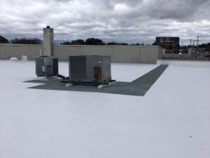 We completed this little fabric reinforced coatings project late in the fall, which was a bit of a challenge with all the leaves coming off the trees and landing on the roof. Thankfully, the project was a success and looked great when we were finished. The customer told me later that by changing the roof from black to white, parts of the interior that they were having trouble cooling in the summer was no longer a problem.